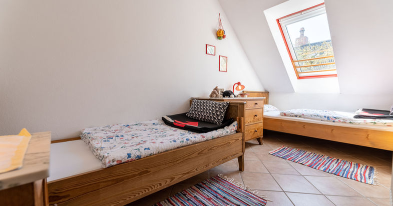Das Eltern- und das Kinderschlafzimmer gehören ebenso zur Wohnung wie die komplett ausgestattete Küchenzeile und die 16 qm große Dachterrasse im Gras- und Blumendach.